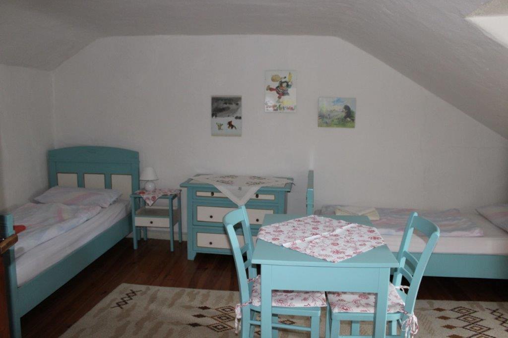 Aus dem Schlafzimmer- sowie dem Wohnzimmerfenster können unsere Ziegen beim Grasen, Klettern und Meckern beobachtet werden. Aus dem Küchenfenster bietet sich ein weiter Blick über die Froschteiche bis hin zum Storchenhorst auf dem Schornstein der Brauerei im Nachbarort Kaltenbrunn. Ein toller Blick über den Hof bieten Ihnen das Wohn- und die Kinderzimmer.
